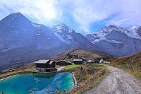 スイスアルプス三大名峰(アイガー, メンヒ, ユングフラウ)が望めるグリンデルワルド(Grindelwald) スイスはアルプスハイキングの定番であり, 4000m級の壮大な山々や氷河を眺めながら美しい自然を満喫できる